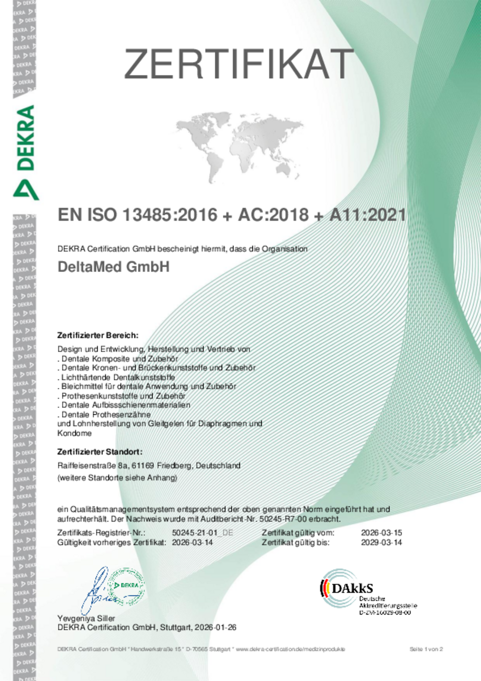 Zur Umsetzung der Qualitätspolitik unseres Unternehmens unterhält die DeltaMed GmbH ein zertifiziertes Qualitätsmanagementsystem nach DIN EN ISO 13485 für Medizinprodukte. Wir sind zertifiziert für die Bereiche Design und Entwicklung sowie Herstellung und Vertrieb von Medizinprodukten gemäß Anhang IX Kapitel I + III der Medizinprodukteverordnung (EU) 2017/745.